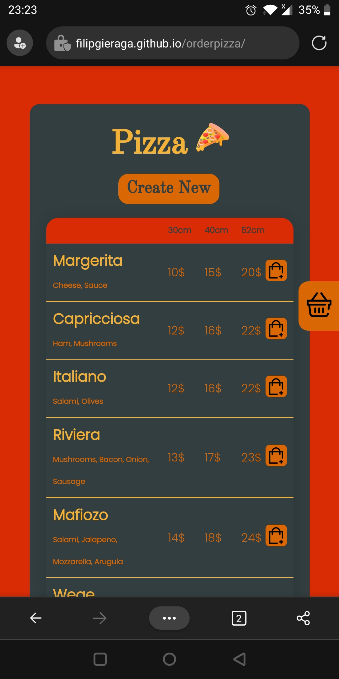 First pop-up allows user to create a new custom pizza that will be added to the menu, pizza can have 3 to 5 ingredients and the prices will adjust accordingly.