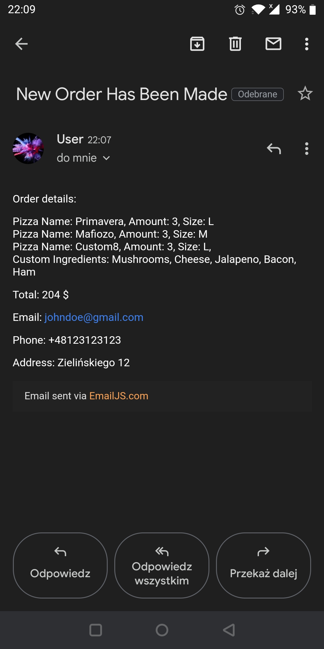 Once you hit the send button those information go to my email with EmailJS in a form shown below. Only Custom orders are shown with ingredients.
